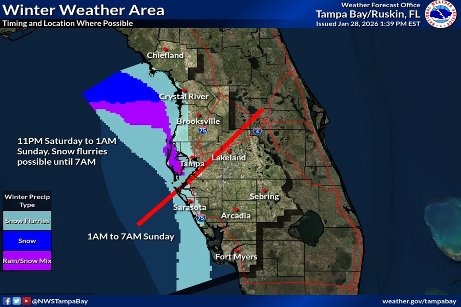 Nevertheless, the best chance of seeing snow flakes fly will be between 11pm and 7 am Saturday night into Sunday morning for areas of Tampa and north and between 1 am to 7am for places south. While snowflakes may reach Sanibel and Captiva Islands and portions of Cape Coral, snow isn’t expected in Ft. Myers or places south.